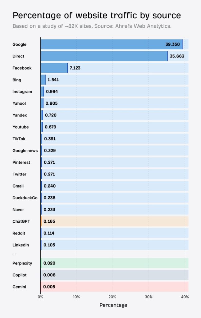 Cependant, malgré cette envolée vertigineuse, il est impératif d’analyser la situation avec lucidité. La part du trafic IA dans l’ensemble des visites d’un site web reste, à l’heure actuelle, marginale. Les géants historiques continuent de dominer très largement le paysage. Google (39,4 %) et le trafic direct (35,7 %) représentent encore les trois quarts de l’audience totale.